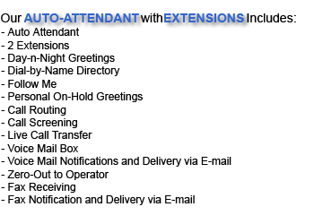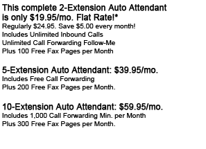 Our Auto Attendant will play a menu that will transfer callers to the right person or department, whether they are at their desk or on their cell, for as little as $19.95mo FLAT RATE with no equipment to buy.